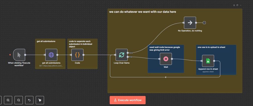 This workflow is a simple example showing how to fetch submissions from JotForm using its API and then use that data in another service — in this case, Google Sheets.